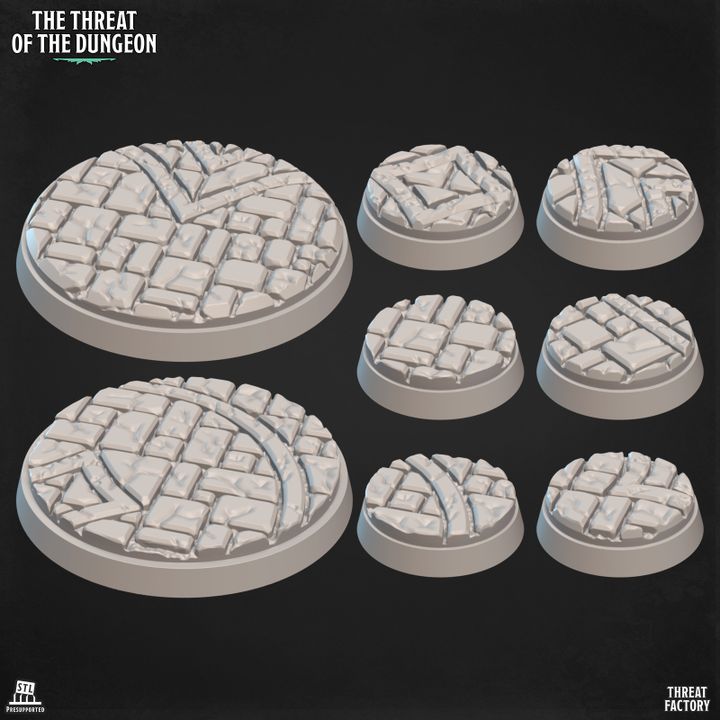 – 6 socles de donjon (25 mm, taille moyenne) – 2 socles de donjon (50 mm, grande taille)